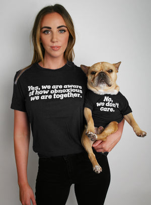 I'm not showing off, this is just me. Crew neck dog shirt, perfect for any four-legged friend. Measure your dog's chest at the thickest part around. If you're between sizes, go with the larger size. *Human shirt not included in this listing.