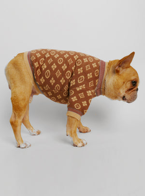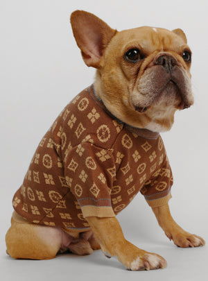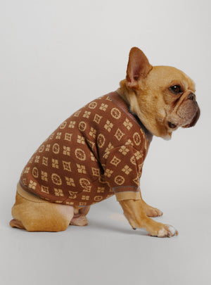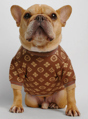 Soft knit pet sweater with high fashion pattern. Huey (the model) has a chest measurement of 20" and is wearing size L.
