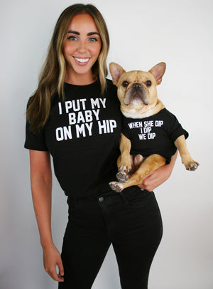 I put my baby on my hip. When she dip, I dip, we dip. This listing comes with 2 (two) tees. One in human sizing and one in dog sizing. Pick your size for each of the 2 t-shirts.