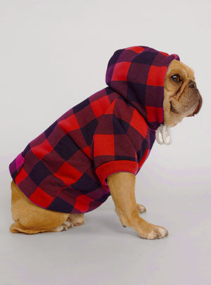 This dog hoodie features: Classic red and black plaid pattern, kangaroo pocket, hole on the back for easy leash access, machine washable, made of 65% cotton, 35% polyester. Huey (the model) has a chest measurement of 21" and is wearing size Medium.