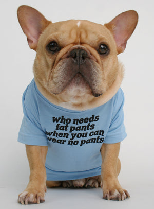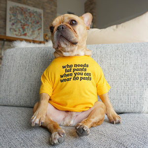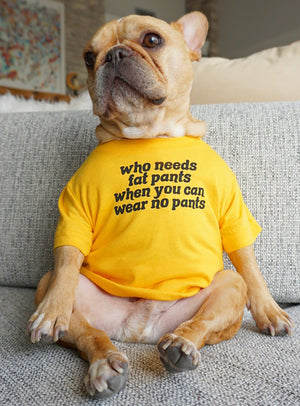 Who needs fat pants when you can wear no pants? Thanksgiving Edition Crew neck dog shirt, perfect for any four-legged friend. Measure your dog's chest at the thickest part around. If you're between sizes, go with the larger size.