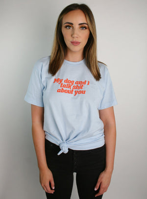 The dog shirt is a crew neck tee, perfect for any four-legged friend. Measure your dog's chest at the thickest part around. If you're between sizes, go with the larger size.