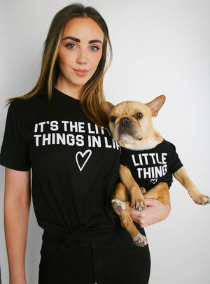 Screen-printed on a 100% cotton tee. Available in unisex sizing. Model is 5'9" and wearing size medium. *Dog shirt not included in this listing.