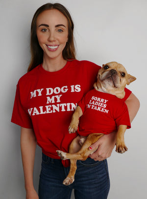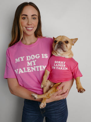 Screen-printed on a 100% cotton tee. Available in unisex sizing. Model is 5'9" and wearing size medium. *Dog shirt not included in this listing.