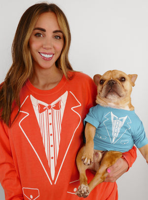 Crew neck dog shirt, perfect for any four-legged friend. Measure your dog's chest at the thickest part around. If you're between sizes, go with the larger size. *Human shirt not included.