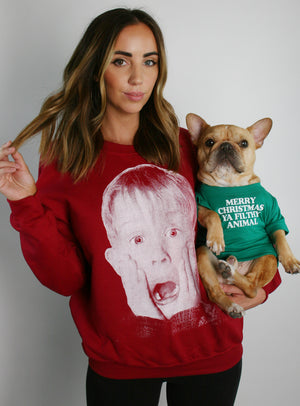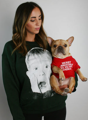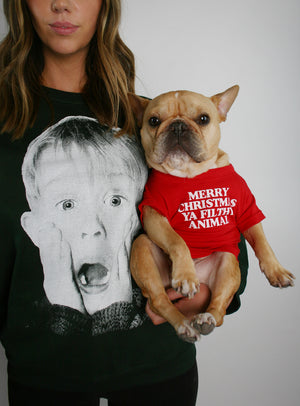 Merry Christmas ya filthy animal. Soft 7.0 oz cotton crew pullover sweatshirt, 40% combed ring spun cotton/60% poly Terry fleece. Hand screen-printed in Austin, Texas. Please note: All unisex styles are in U.S. Men's sizing. *Dog Tee sold separately.