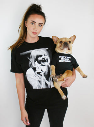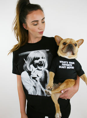 What's your favorite scary movie? This listing comes with 2 (two) tees. One in human sizing and one in dog sizing. Pick your size for each of the 2 t-shirts.