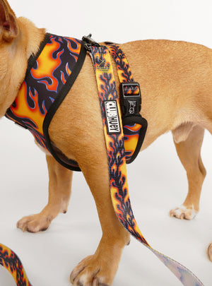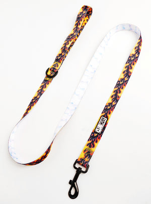 This leash was made for walkin'. Featuring a neoprene padded handle for a soft, comfortable grip, (1in. wide X 5ft. length), vibrant dual printed polyester webbing strap, and heavy duty black clip leash end. A perfect accompaniment for our reversible harness or collar.