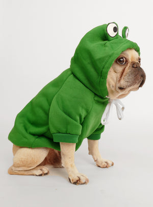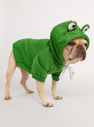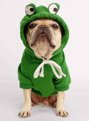 Hop to it in this frogtastic dog hoodie. Perfect for pretending you're a prince in hiding, or just staying warm and relaxing.