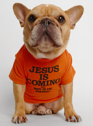 Jesus is coming and boy is he pissed. Crew neck dog shirt, perfect for any four-legged friend. Measure your dog's chest at the thickest part around. If you're between sizes, go with the larger size.