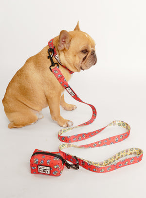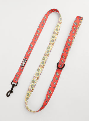 This leash was made for walkin'. Featuring a neoprene padded handle for a soft, comfortable grip, (1in. wide X 5ft. length), vibrant dual printed polyester webbing strap, and heavy duty black clip leash end. A perfect accompaniment for our reversible harness or collar.